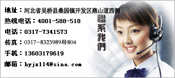 地址:河北省吳橋縣桑園鎮(zhèn)開(kāi)發(fā)區(qū)燕山道西側(cè) 熱線電話(huà):4001-588-518 郵編:061800 電話(huà):0317-8323988 傳真:0317-8323991